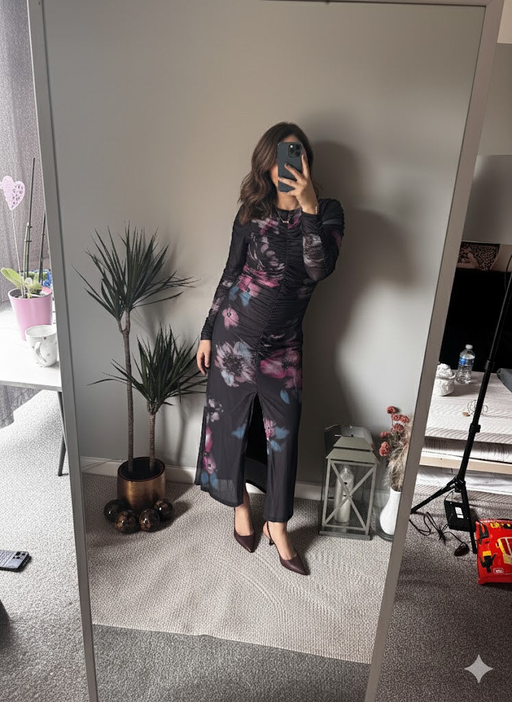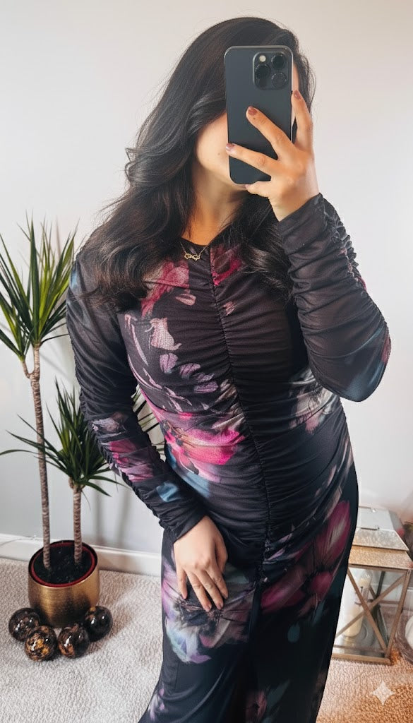 The Alessia Floral Mesh Maxi Dress in Midnight Bloom is the perfect statement piece for your evening wardrobe. Featuring a rich dark base with vibrant purple and blue floral accents, this dress brings modern elegance with a hint of drama.