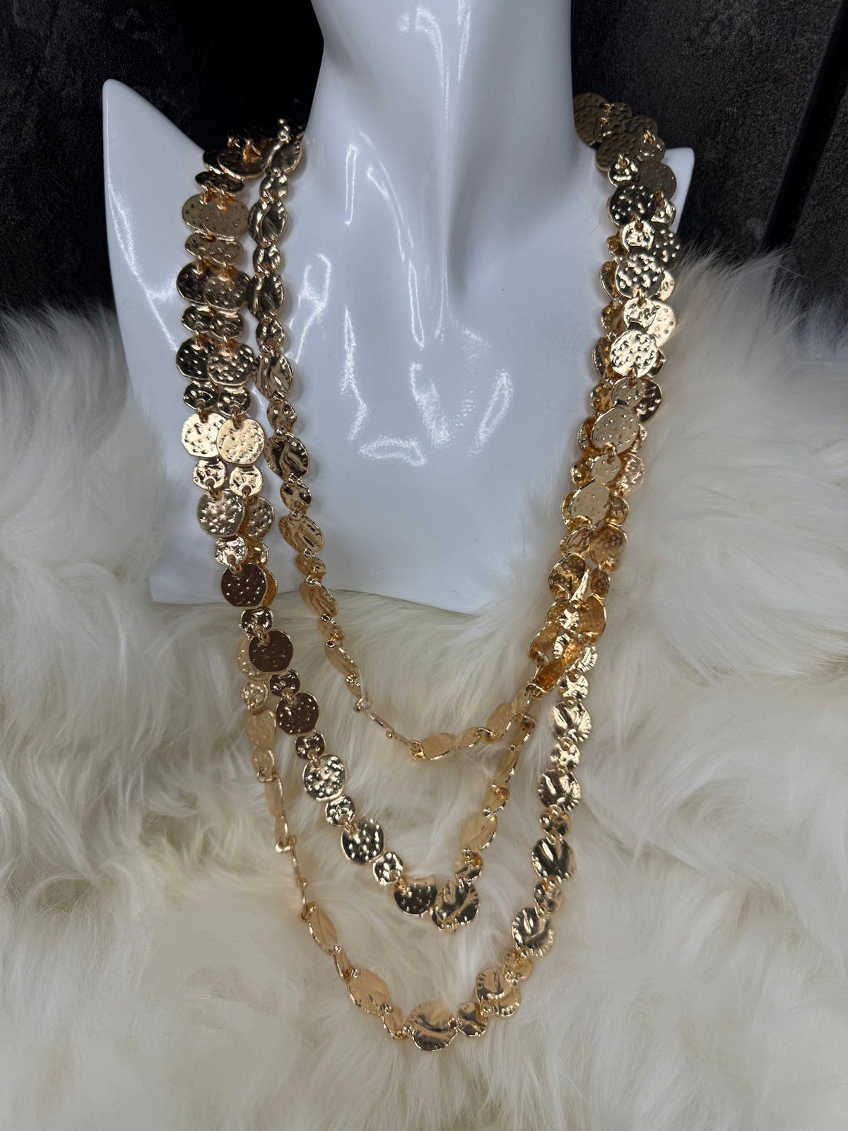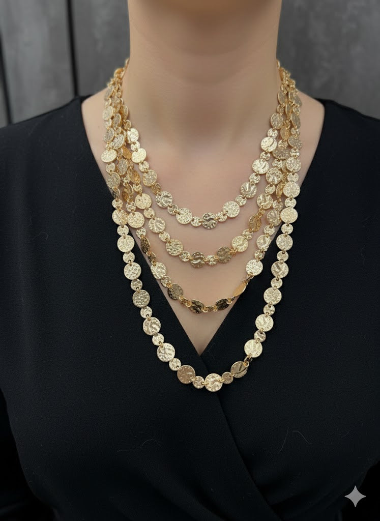 Elevate your everyday elegance with Dirham, a statement necklace inspired by the richness of ancient coin jewellery. Designed with a cascade of hammered gold discs, each piece catches the light beautifully, creating a luxe, liquid-gold shimmer with every movement.