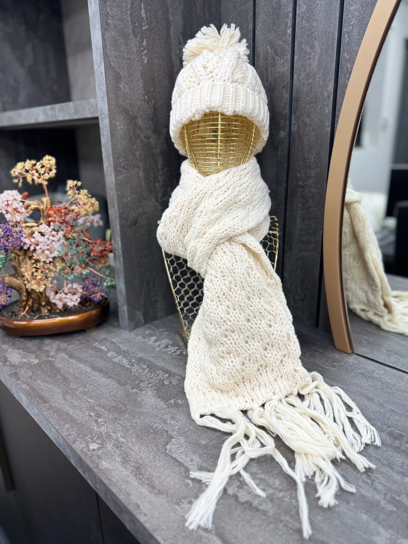Hand-Knitted Winter Hat & Scarf Set - Cream
