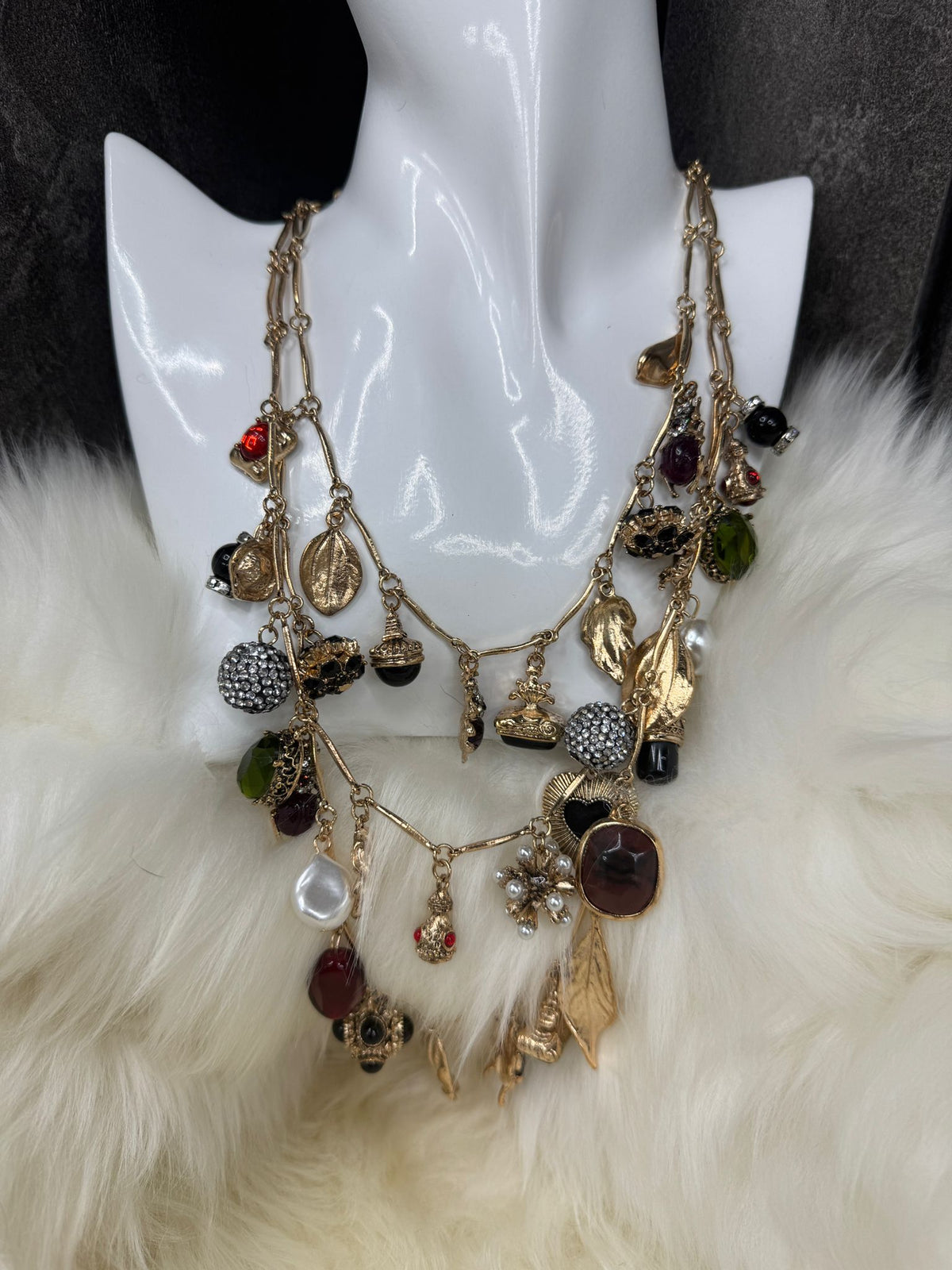 Upgrade your jewellery collection with Jasmine, a breathtaking multi-layer charm necklace crafted for women who love bold elegance. This piece blends intricate detailing with a modern, artistic edge — featuring cascading statement charms, textured metals, glimmering stones and glossy pearls arranged beautifully along a triple-layer silver chain.